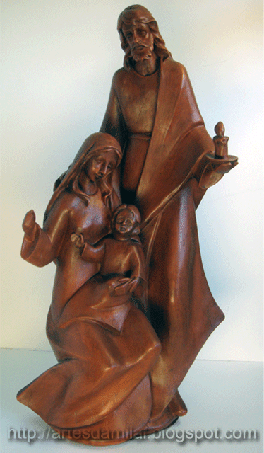 São ambos de chacota branca. O primeiro foi pintado com uma cor de barro  e em seguida foi encerado com cera escura o que faz com que quem olha para ele pense que é de madeira. Na foto não se vê muito bem o efeito, mas para mim ficou muito bonito.