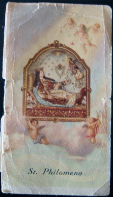 A pagela que se encontra do lado esquerdo veio da Itália, trazida por um italiano amigo e mostra o túmulo da Santa que se encontra em Mugnano perto de Nápoles. Como podem ver está bastante usada. Contém uma súplica escrita por Fr.Miguel R.Camerlengo - Bispo de Nola. Como é diferente da que a Kristal colocou eu vou deixá-la para quem precisar ou quiser orar a Santa Filomena.