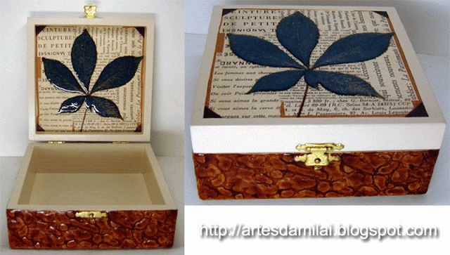 Hoje venho mostrar-vos mais uma caixa. Fi-la para aprender a técnica do couro australiano. Mas como não me agradam as cores que é usual porem, apenas coloquei o Hidro Vitral cor Fume e ficou com este aspecto de que gostei bastante. Depois foi só escolher um guardanapo que combinasse bem e a minha opção foi esta. Realcei a folha com Hidrolaca Brilhante tanto no interior como no exterior.