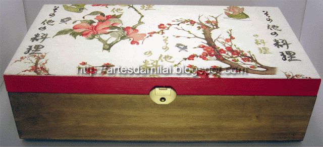 A caixa tem os mesmos tons e vai servir para guardar aqueles medicamentos que tenho que tomar todos os dias e que assim ficam num sítio só. Optei por colocar papel de arroz com este motivo para se um dia a quiser para outro fim não ficar presa a uma decoração. Do interior não tirei foto pois é igualmente em tom de madeira. Eu gostei do resultado final e colocadas as três muito perto umas das outras enquadram-se perfeitamente.