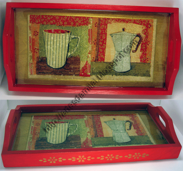 Inclusivé consegui colocar-lhe um friso dourado que delimita o motivo e também à volta do tabuleiro mesmo junto à madeira. Na foto não dá para ver muito bem. Levou vidro frio para protecção.