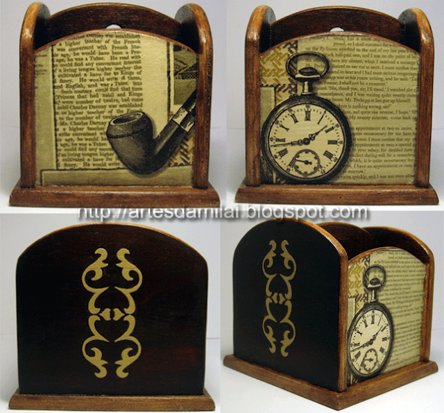 Como queria experimentar coisas novas resolvi fazer umas texturas em madeira. O porta canetas e lápis levou dos lados pasta de modelar colocada com um stencil para emitar um falso entalhe. À frente e atrás apliquei guardanapo. Acho que ficou bem masculino e a ideia era mesmo essa.