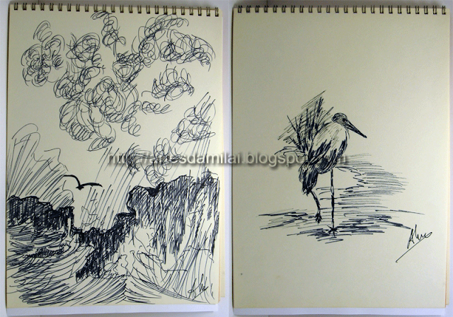 Deixo-vos uns rabiscos que se pretendem assemelhar a desenhos e que são do mesmo tempo dos outros que já aqui mostrei. Lembro-me que o primeiro do lado esquerdo foi feito ao som da canção BE do filme Fernão Capelo Gaivota, música do Neil Diamond. Ouçam e vejam porque vale a pena! Adoro a  banda sonora deste filme, é linda!