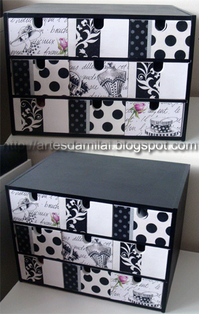 Fi-lo para pôr no quarto da minha filha, em cima de um móvel branco. Pintei-o por fora de preto e as gavetas são todas em branco. Utilizei os 3 temas de padrões que ela tem noutros objectos que se encontram no quarto. Esses objectos eu já aqui coloquei e são a caixa de costura preta e branca, o porta canetas e o prato das bolas. Deste modo o móvel ficou perfeitamente enquadrado e os motivos também. Ela gostou e eu também.
