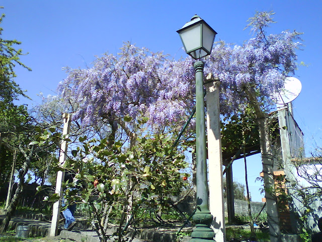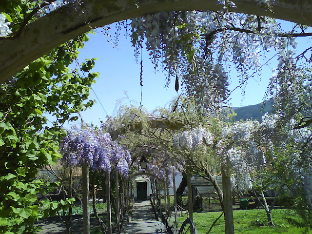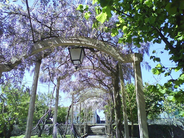 Miranda do Corvo. Foi nesta casa que o meu Pai nasceu e em que eu brinquei quando era criança. Estas fotos foram tiradas no dia 9 de Abril e o tempo estava nessa altura bem melhor do que o que tem estado agora. As glícineas que cobrem completamente os arcos estavam a começar a sua floração. Nessa altura já o aroma era bastante intenso e as abelhas e zangões já andavam a fazer a sua colheita.