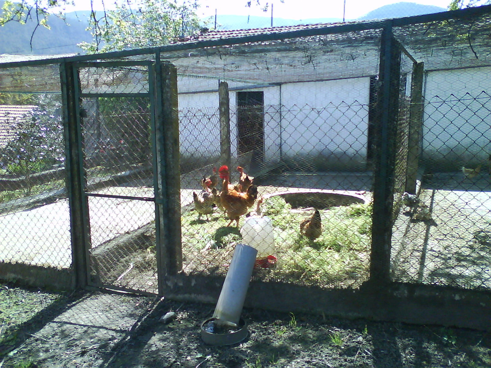 Aqui estão as nossas fornecedoras de ovos e carne. Do lado direito as mais velhas e do lado esquerdo os mais novos. Quando já não existe plantação nenhuma no quintal, tanto as galinhas como o pavão andam à solta. Lembram-se da gripe das aves e do que se falou e fez por causa desse "medo"? Pois é, nestas capoeiras não consegue entrar nem um único pássaro.