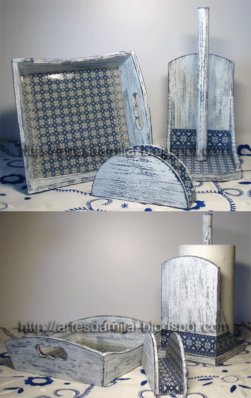 Bom dia para todo o Mundo! Muito obrigada pelas visitas que me fizeram e em especial pelos comentários que me deixaram. Como já devem ter reparado, não tenho deixado os habituais comentários nos vossos cantinhos, pois tenho andado novamente com problemas a nível de visão. Só 2ª feira é que tenho consulta, por isso até lá e por precaução vou evitar andar muito tempo por aqui. Vim apenas deixar-vos mais um trabalho para não ficarem sem novidades. Desta vez é um conjunto de 3 peças em pátina provençal azul e branco e com a aplicação de guardanapo a imitar azulejo . O tabuleiro tem uma renda do lado das asas aplicada no fundo, mas devido à marca de vidro frio que utilizei perdeu-se o efeito que eu queria. O vidro que eu tenho é da La Pajarita e não é totalmente branco. Tem um tom de mel claro o que faz com que um trabalho como este, com tons de branco se perca quase totalmente o efeito pretendido. Tenho que mudar de marca pois não estou satisfeita com este resultado.