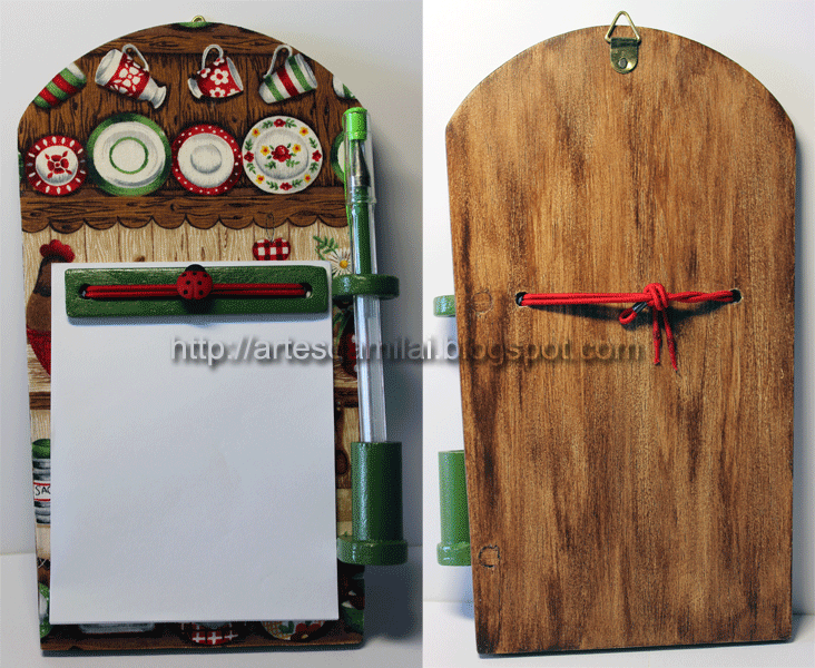 Hoje deixo-vos um suporte para um bloco com a particularidade de podermos ter sempre à mão uma esferográfica ou um lápis, para anotar-mos o que nos faz falta. No meu caso se não escrever, quando vou ao super, metade fica por trazer e às vezes vêm coisas que já tinha...eheheheh. Está com um ar rústico porque o fiz para a casa da aldeia. Utilizei tecido, tinta acrílica e a tinta Stains da Americana.
