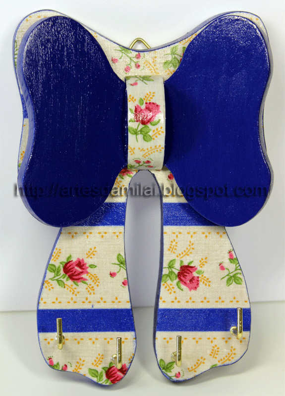 Boa tarde para toda a gente. Por aqui parece que chegou finalmente ( e para mim, infelizmente ) o calor e em força. À bocadinho à sombra estavam 38º . Espero que isto não dure muitos dias seguidos, senão lá fica a casa um verdadeiro forno. Hoje trago-vos um cabide em forma de laço que comprei ao Armando. Este é o segundo que faço o outro podem vê-lo aqui. Utilizei chita de Alcobaça e tinta acrílica a condizer. Acho que ficou bem alegre e consegue dar cor a uma cozinha.