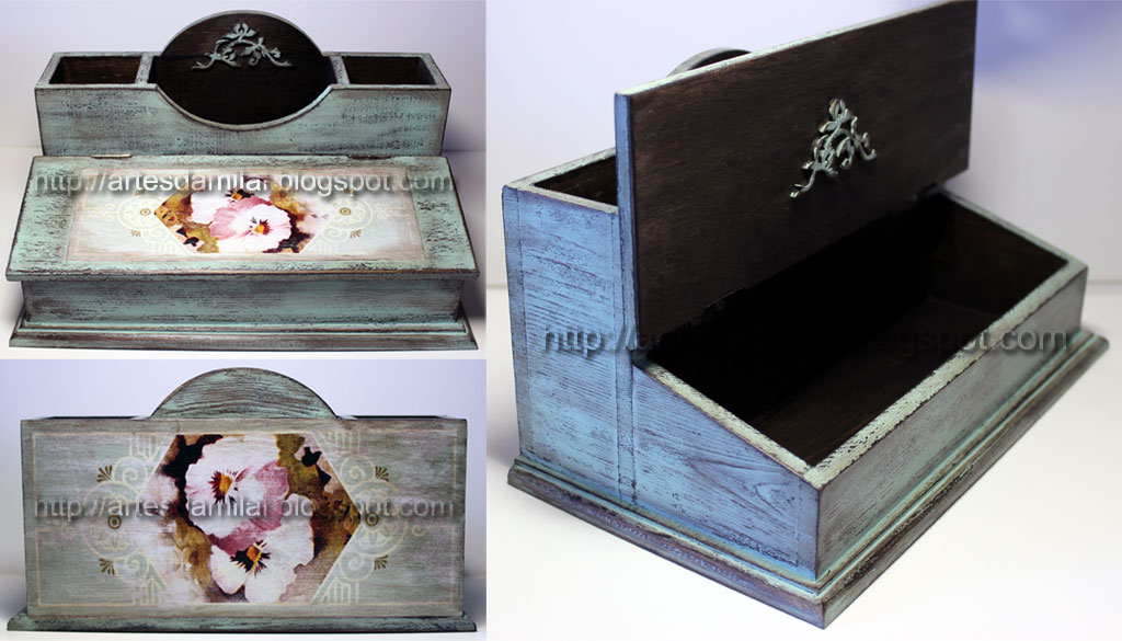 Deixo-vos hoje um suporte para secretária que gostei muito de fazer. Um estilo vintage com decoupage ( a imagem foi tirada daqui) e pátina provençal em tom de azul. Coloquei duas aplicações que achei que fariam a diferença. Espero que gostem.