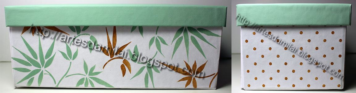 Hoje deixo-vos uma simples caixa de cartão do Ikea e que a minha filha me pediu para decorar (podem ver aqui o original). Ela é que escolheu as cores, um azul esverdeado e um dourado, e os stenceis (claro que os lados contrários são iguais aos que vêm). Foi muito fácil de fazer e o resultado agradou~lhe muito. A cor parece verde mas não é. É um tom muito bonito da Americana e que se chama Sea Glass e é um azul esverdeado (a luz engana muito).
