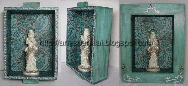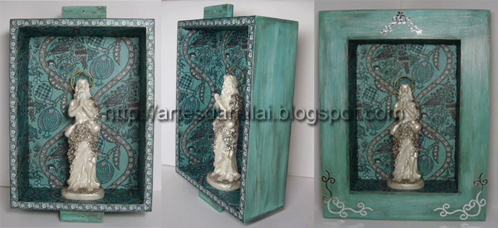 Boa tarde para todo Mundo! Muito obrigada pelas vossas visitas e em especial por todos os comentários deixados. Dou também as boas vindas às novas seguidoras. A peça que vos deixo hoje, não foi comprada para este fim. Esta moldura com vidro, era suposto ter levado um trabalho de arte francesa, só que eu não tenho mesmo jeito nenhum para tirar medidas a olho e vai daí errei. Quando cheguei a casa com ela, verifiquei que o papel não cabia lá dentro. Como me chateia andar a trocar coisas decidi aproveitá-la para qualquer outra coisa. Então tive uma "ideia luminosa", e resolvi fazer dela um oratório. Como não tinha Santo nenhum tive que ir à procura de um que coubesse lá dentro e não ficasse desproporcionado. Então o único Santo nestas condições que "veio ter comigo" literalmente, foi um Santo que eu até desconhecia e que é o Santo Onofre. Se quiserem saber mais sobre ele cliquem