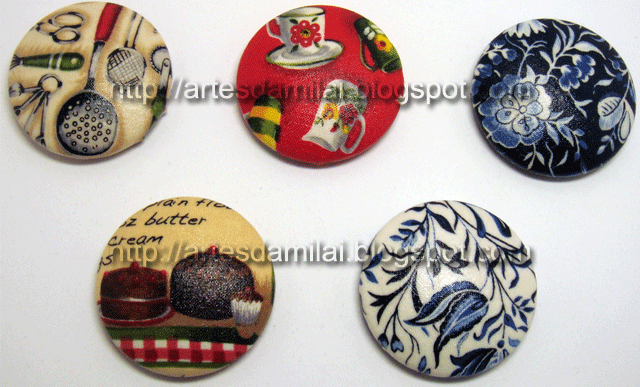 O segundo são uns ímanes muito simples. Forrei o suporte de madeira com tecido, apliquei hidrolaca brilhante e cá estão eles. Não pode ser mais fácil, mas fazem um efeito muito giro no frigorífico!
