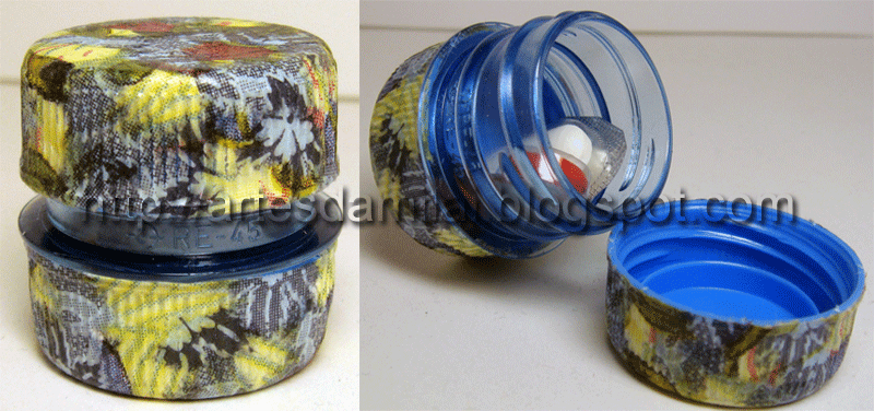 Começo pelo mais antigo. Quando vi a ideia no blogue da Carolina Maraboli que nos remete para o seguinte passo a passo no blogue Reciclín e Reciclán achei muito gira e resolvi que tinha que experimentar. Meu dito, meu feito. Tinha duas garrafas de água iguais em casa, cortei uma até deixar só o tamanho de gargalo necessário para encaixar uma das tampas e servir de fundo e a outra tampa fica na própria rosca. Pintei as duas tampas de branco e fiz decopatch com guardanapo. No fim as tampas levaram verniz para protecção. Sei que ando há um tempão com ele na carteira, pois é onde transporto os comprimidos que me acompanham no dia a dia, e está impecável como podem ver pela foto. Confesso que já tenho guardados uma data de gargalos e de diversos tamanhos para fazer outros, mas infelizmente não tenho tido tempo.