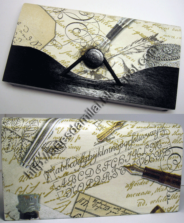 Pintei-o com tinta de vidro preta, por dentro, na parte de baixo, nos lados e também no botão onde prende o elástico. O resto foi decoupage com guardanapo. Como o elástico que vinha com este estojo era castanho, comprei um pouco de elástico preto e foi o que lhe coloquei para jogar melhor com o guardanapo que escolhi. Também destes estojos já tenho outros pensados, mas uma vez mais vão ter de esperar, pois actualmente e tal como muitas outras pessoas, o meu dia precisava de ter 48 horas no mínimo!